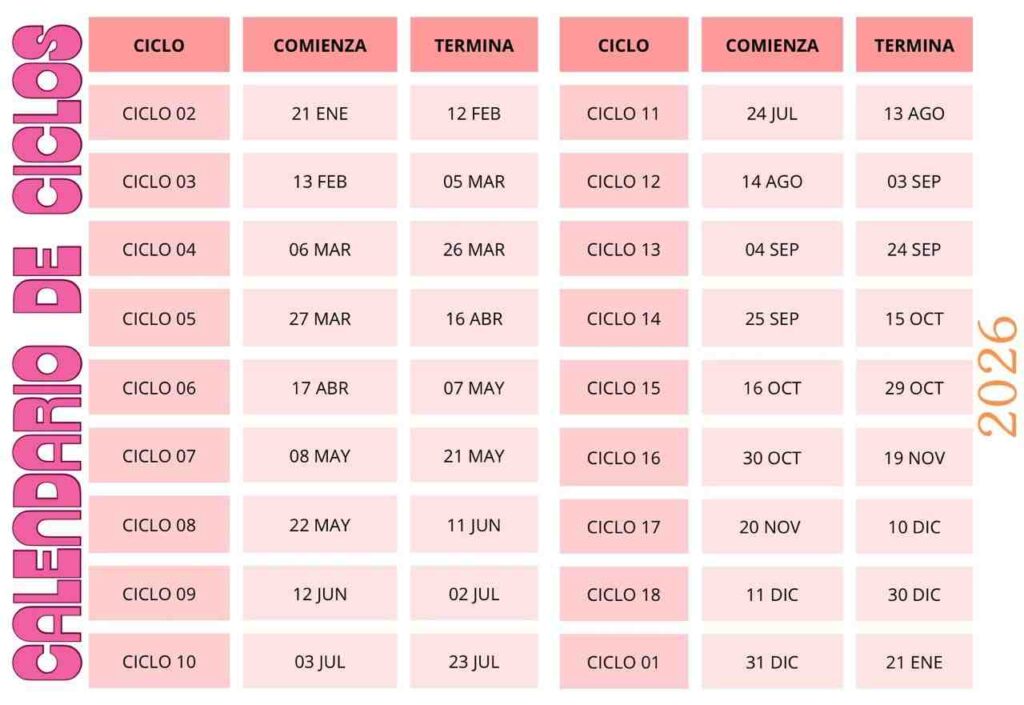 En ésta página encontrarás el Calendario de Ciclos Natura México 2026. En pocas palabras podrás descargar el Calendario Ciclos Natura 100% actualizado para el territorio Mexicano. Una herramienta que te será de gran ayuda para poder anticipar tu ciclo, ó simplemente adelantarte a los lanzamientos apoyándote del catálogo que saldrá.